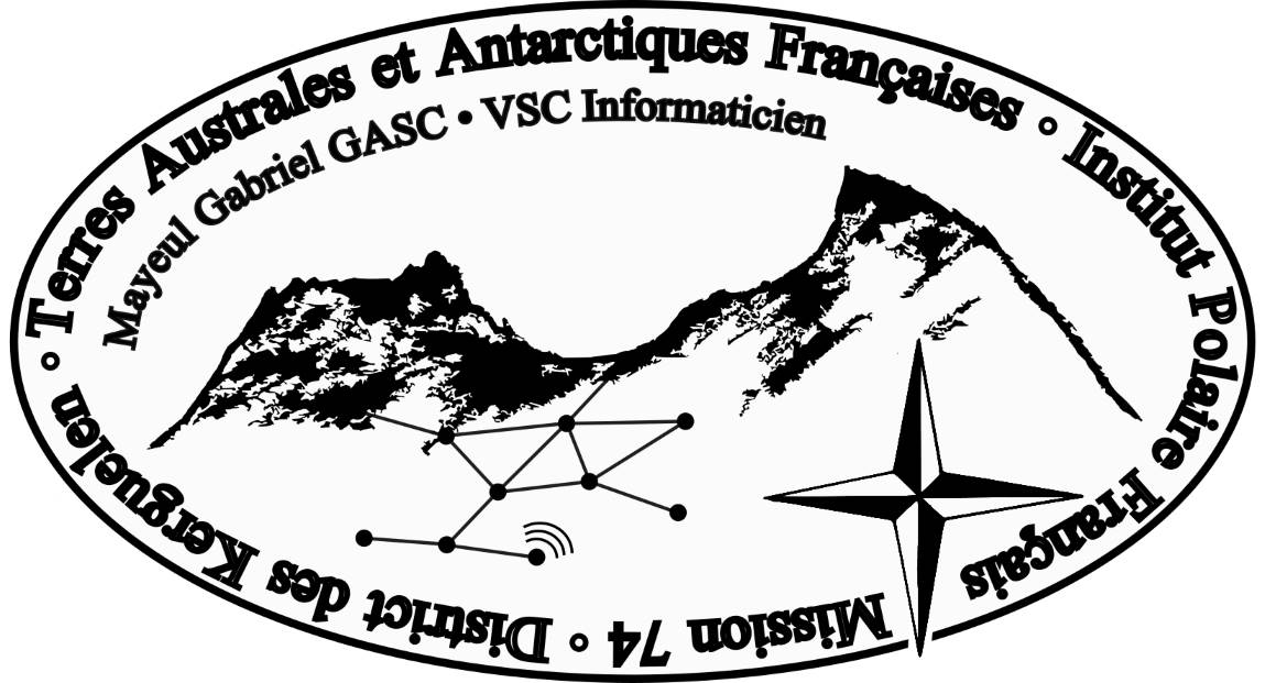 Je commence par brouillonner quelques dessins, sans grand succès. Je finis par me baser sur la photo Wikipédia du Mont Ross, la plus haute montagne des Kerguelen (1850 m !), pour en tirer un dessin d’interprétation assez libre (ou si vous préférez, à la ressemblance limitée). Je dessine également une rose de vents (géométrie niveau collège, ça a été plus simple) et un réseau minimaliste. Dans l’ordre, le Mont Ross illustre bien sûr les Kerguelen, mais aussi ma terre d’origine, les Pyrénées, ainsi que mon intérêt certain pour la montagne. La rose des vents traduit l’isolation géographique et l’environnement marin de la mission, tandis que le réseau illustre mon métier sur place. Une fois l’ensemble dessiné, je vectorise chaque image dans Inkscape (première expérience pour moi !) et j’ajoute le texte pour créer l’arrangement final :